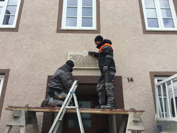 Haustafel, auf der die Geschichte des Stadtviertels und des Hauses erläutert wird.