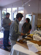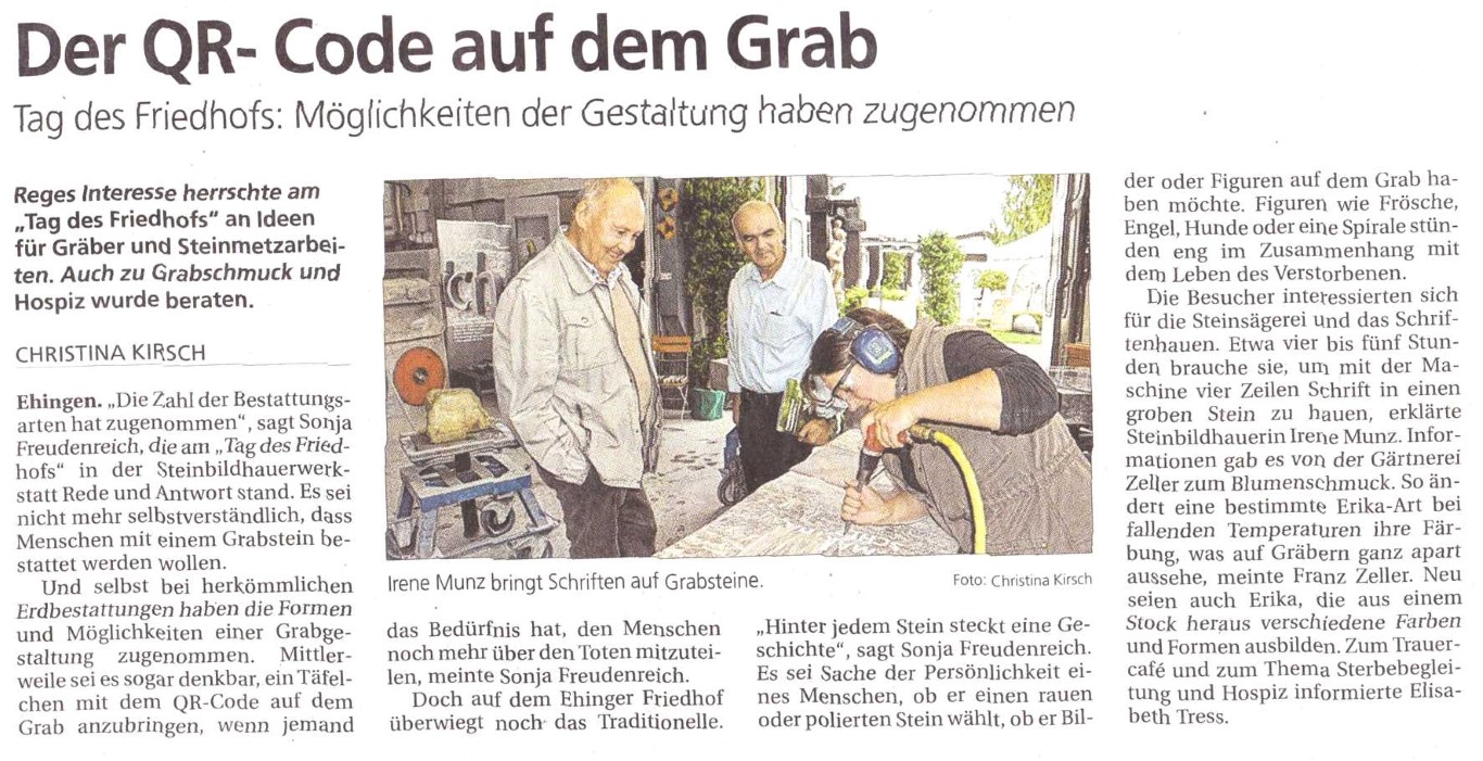15. September 2013 - Tag des Friedhofs - Schausonntag Einen abwechslungsreichen „Tag des Friedhofs“ konnten wir dieses Jahr gestalten. Das Wetter begleitete uns ebenso abwechslungsreich mit Wolkenbruch und Sonnenschein. Ein ganz verändertes Aussehen zeigte unser Betrieb, da wir einfach mitten in die Ausstellung hinein ein freundliches Zelt platzierten. Hier präsentierte die Gärtnerei Zeller Beispiele für Grabbepflanzungen und Gestecke. Die Möglichkeit zum Gespräch mit Fragen rund um Pflanzung und Pflege wurde auch in diesem neuen Rahmen gerne angenommen. Wir wollten zeigen, wie wir am Stein arbeiten und Werkstücke hier bei uns zurichten, deshalb wurde in unserer Werkhalle wirklich gewerkelt. Überrascht und interessiert beobachteten die Besucher Sägearbeiten mit Lärm und Wasser und die Arbeit der Bildhauerin faszinierte ganz besonders. Dazu hatten wir selbstverständlich auf dem ganzen Gelände schöne neue Ausstellungsstücke dekoriert. Die Ökumenische Hospizgruppe informierte über ihr Angebot: „Du bist nicht allein“ ist die zentrale Aussage. Begleitung Schwerkranker und Sterbender ist ihr Anliegen, Trauercafe und Gesprächsrunden werden gemeinsam gestaltet. Der umfassende Büchertisch des „Ehinger Buchladen“ lud ein zum Stöbern und „Reinschmecken“ in Literatur. |