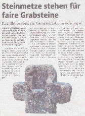 | Juni 2012 - Ein Zeichen der Verbundenheit, der Kreativität – und wider die Wegwerfmentalität Wenn ein Grab aufgelöst werden muss, ist das oft mit einem erneuten Abschiedsschmerz verbunden. Schön, wenn dieser durch die Umgestaltung und Wiederverwendung der Steine aufgelöst werden kann. So lassen Kunden derzeit aus ihren abgebauten Grabdenkmalen in unserer Werkstatt Erinnerungssteine für den Garten fertigen: es entstehen zwei Stelen mit Rose und Lebensspirale, zwei Schriftsteine, Trittplatten für das Rosenbeet, ein Vogelbad und ein Pflanztisch. |