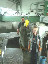 Ein besonderer Höhepunkt der Woche war der Besuch in unserer Steinmetzwerkstatt. Hier werden Natursteine handwerklich bearbeitet, aber Maschinen können auch helfen: Stapler, Kran, Brückensäge und Presslufthammer, die am Stein im Einsatz waren, beeindruckten die Schüler.