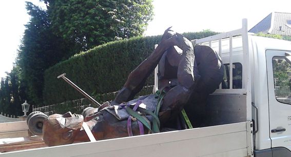 Eine Taxifahrt der besonderen Art unternahm die Figur auf unserem LKW, um an ihren neuen Sitzplatz zu gelangen.