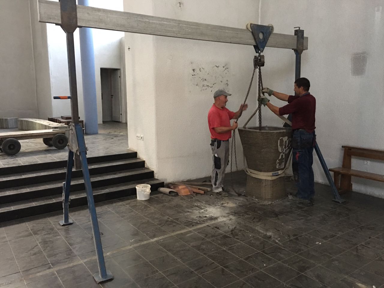 Eine besondere Herausforderung ist dabei der schadensfreie Transport über verschiedene Untergründe und Ebenen aus der Kirche heraus.