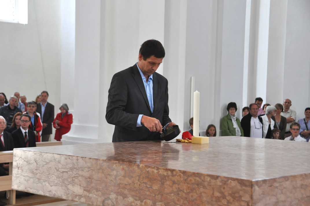 Bischof Fürst und Stadtpfarrer Gehrig legen die Reliquien ins Sepulcrum.