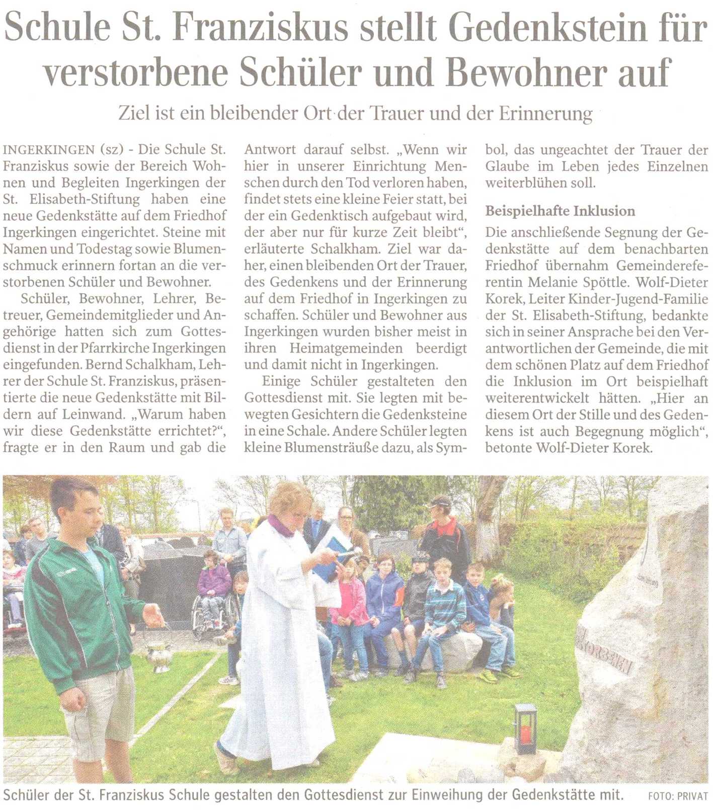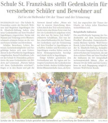 Die Schule St. Franziskus, Ingerkingen, stellt einen Gedenkstein für verstorbene Schüler und Bewohner auf.
